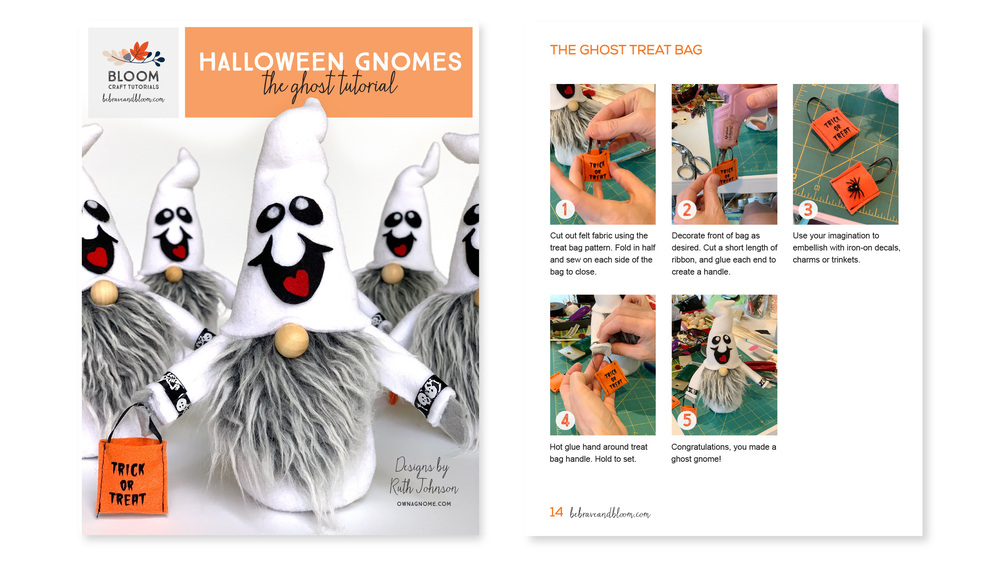 Artist, Ruth Johnson shares her tips and tricks, along with a step-by-step tutorial to make an adorable handmade Halloween ghost gnome. The ebook includes photo instructions, a pattern, plus a materials list, and supply buying ideas.